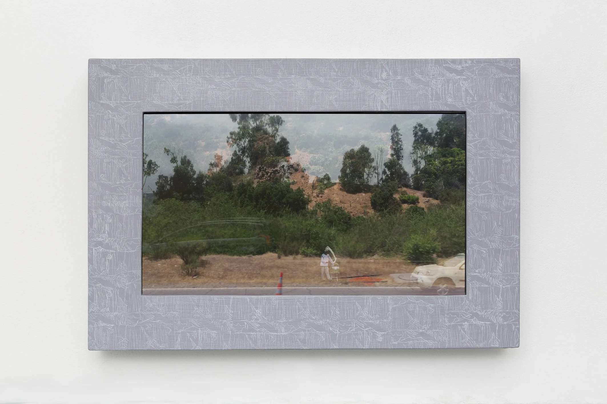 As an installation, the work includes a painted frame positioned close to the ground, and cushions to sit on, close to the screen.